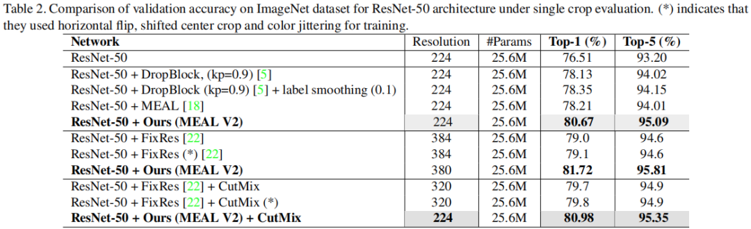 在ImageNet数据集上,本文所提方法取得了80.67%的Top1精度(single crop@224),以极大的优势超越其他同架构方案。该方法可以视作采用知识蒸馏对ResNet50涨点的一个新的基准,该文可谓首个在不改变网路架构、无需额外训练数据的前提下将ResNet提升到超过80%Top1精度的方法。