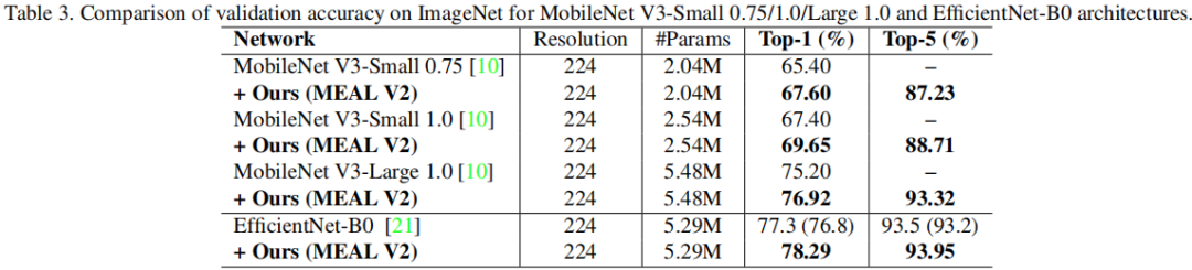 上表给出了所提方法在MobileNetV3与EfficientNetB0上的性能对比。可以看到:MobileNetV3-Samall-0.75的性能提升了2.20%,MobileNetV3-Small-1.0的性能提升了2.25%, MobileNetV3-Large-1.0的性能提升了1.72%, EfficietnNet-B0的性能提升了1.49%(76.8/93.2源自EfficientNet原文,而77.3、93.5源自rwightman大神)。在轻量型模型上取得这样的性能提升着实令人惊讶,要知道,该文方法不会导致推理的任何调整。