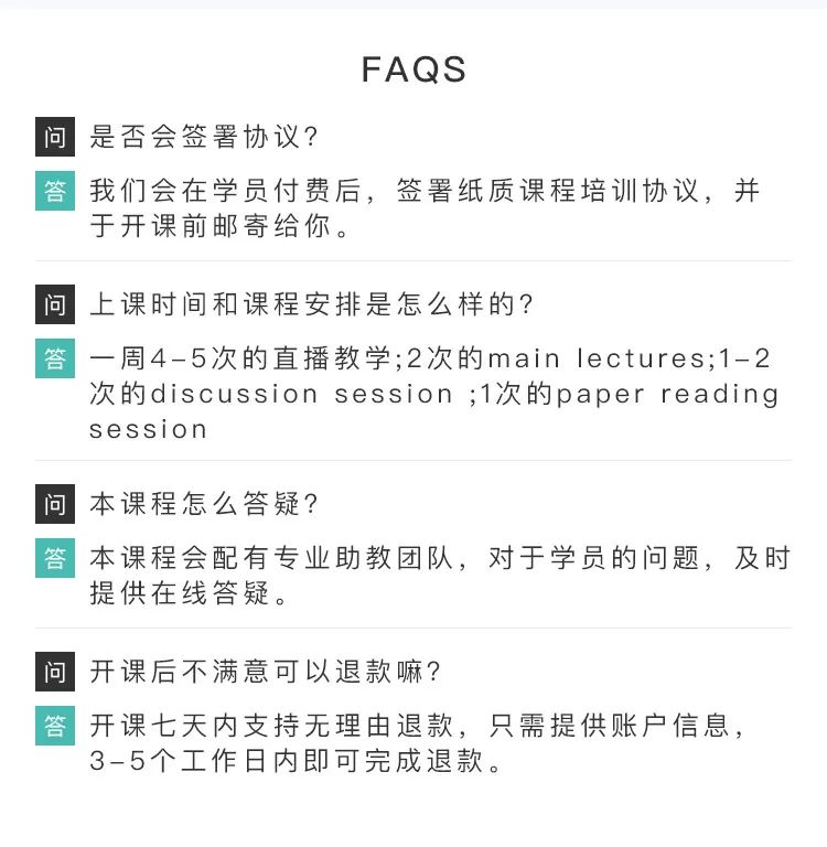采用直播的授课方式,每周3-4次直播教学,包含核心理论课、实战课、复习巩固课以及论文讲解课。教学模式上也参考了美国顶级院校的教学体系。以下为其中一周的课程安排,供参考。