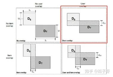 第二张图(右上图),两个域的用户有部分交集,但是物品没有交集。这种情况可以理解成鬼畜用户和舞蹈用户会有部分交集,这部分用户他们既访问了鬼畜区的视频又去舞蹈区看了小姐姐。