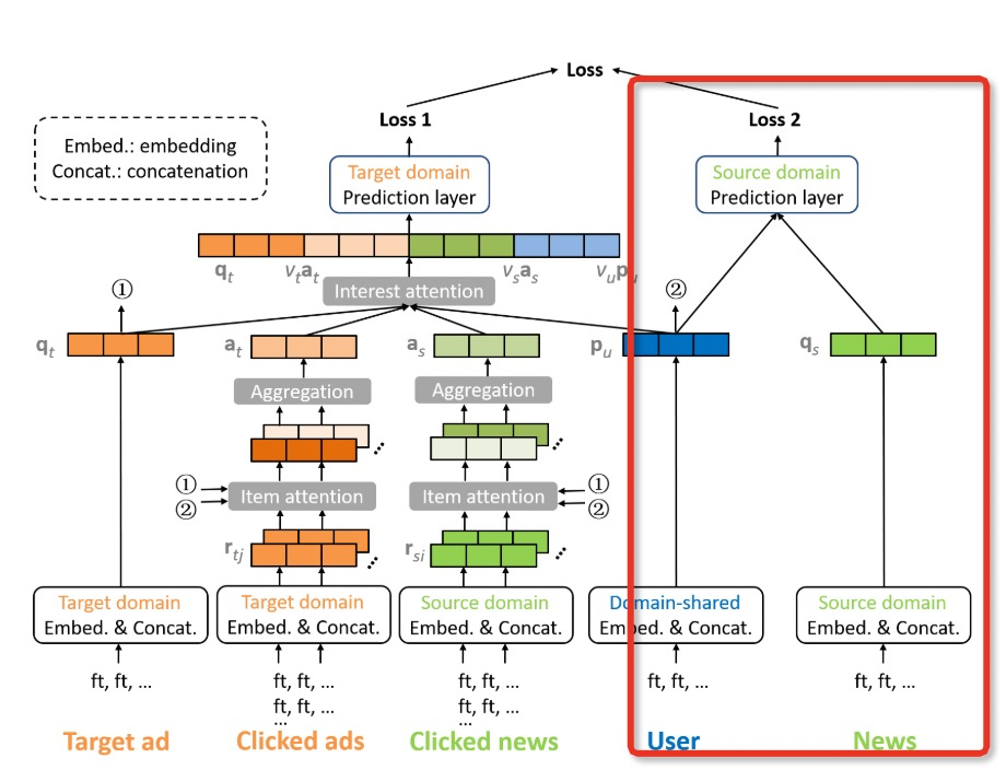 跨域长期兴趣(Long-term interest across domains).用户的profile feature能反映出他长期的、固有的兴趣。通过跨域数据(用户交互过得所有的新闻和广告记录)可以学习出一个包含更多语义信息和可信度更高的user embedding。简单来说,就是通过用户的基本信息建模用户的内在长期兴趣