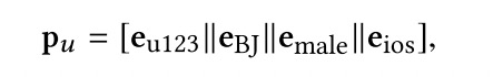 这里主要是通过用户的基本属性信息来表示⽤户内在的⻓期兴趣,⽐如20岁左右的男性⽤户可能对体育赛事或者游戏类的资讯或者⼴告⽐较感兴趣。这⾥主要做法是将⽤户ID、⽤户性别、⽤户所在地域、⽤户的⼿机设备等embedding向量进⾏拼接,输出为pu。例如⽤户ID为123,城市为北京,男性⽤户,使⽤苹果⼿机,得到的⻓期兴趣表示为: