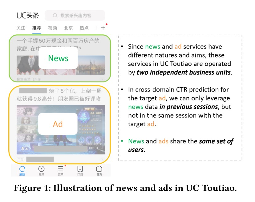 本文基于UC头条的应用场景,将新闻feed流作为源域,广告作为目标域。跨域点击率预估的最大优势在于通过使用跨域数据,目标域中的数据稀疏和冷启动问题都能得到缓解,这也是为什么能提高推荐性能的原因。
