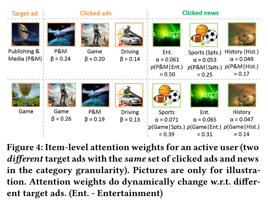 而interest-level attention要解决的就是问题4:对于每个目标广告,三种用户兴趣的重要性是不一样的。如果⽬标⼴告和⽤户最近点击的⼴告相似,那么⽤户在⽬标域的短期兴趣则会起到更重要的作⽤,如果⽬标⼴告和⽤户点击过的⾃然结果和⼴告都不相似,则⻓期兴趣则会起到更重要的作⽤。