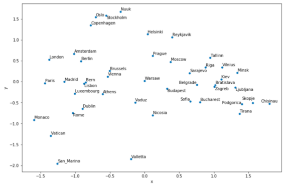 现在是测试函数的时候了。我画出了欧洲国家的首都。你可以使用任何列表,例如总统或其他历史人物的名字,汽车品牌,烹饪原料,摇滚乐队等等,只要在word_list参数中传递它。很有意思的是看到一堆堆的东西在两个轴后面形成一个意思。
