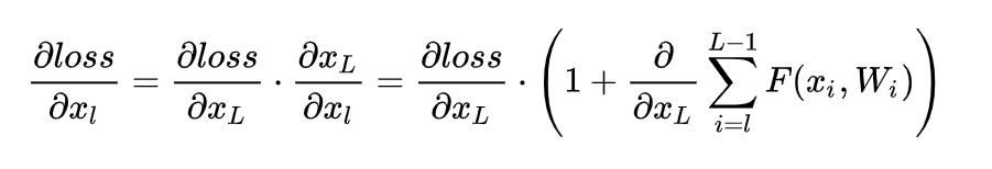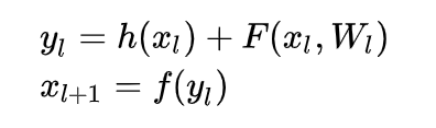 其中 XL和 XL+1分别表示的是第L个残差单元的输入和输出,注意每个残差单元一般包含多层结构。F是残差函数,表示学习到的残差,而 h(XL)=XL表示恒等映射, F是ReLU激活函数。基于上式,我们求得从浅层 l到深层 L 的学习特征为: