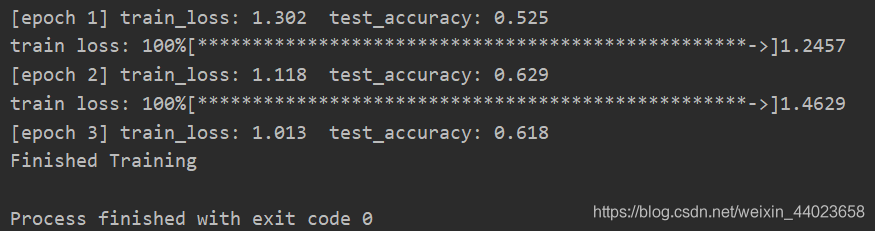 for epoch in range(3):# trainnet.train()running_loss = 0.0for step, data in enumerate(train_loader, start=0):images, labels = dataoptimizer.zero_grad()logits = net(images.to(device))loss = loss_function(logits, labels.to(device))loss.backward()optimizer.step()# print statisticsrunning_loss += loss.item()# print train processrate = (step+1)/len(train_loader)a = "*" * int(rate * 50)b = "." * int((1 - rate) * 50)print("\rtrain loss: {:^3.0f}%[{}->{}]{:.4f}".format(int(rate*100), a, b, loss), end="")print()# validatenet.eval()acc = 0.0 # accumulate accurate number / epochwith torch.no_grad():for val_data in validate_loader:val_images, val_labels = val_dataoutputs = net(val_images.to(device)) # eval model only have last output layer# loss = loss_function(outputs, test_labels)predict_y = torch.max(outputs, dim=1)[1]acc += (predict_y == val_labels.to(device)).sum().item()val_accurate = acc / val_numif val_accurate > best_acc:best_acc = val_accuratetorch.save(net.state_dict(), save_path)print('[epoch %d] train_loss: %.3f test_accuracy: %.3f' %(epoch + 1, running_loss / step, val_accurate))print('Finished Training')