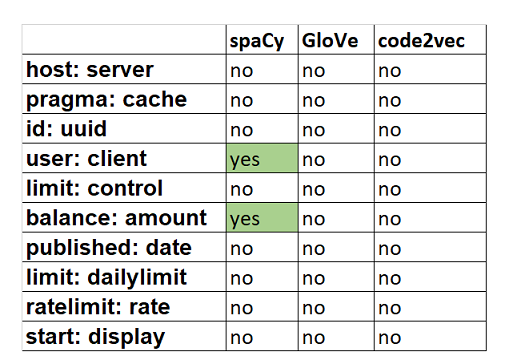 我们已经为OpenAPI规范尝试了三种不同的词嵌入算法。尽管这三个词在这个数据集上都表现得很好,但是对最相似的单词进行额外的比较表明spaCy对我们的情况更好。