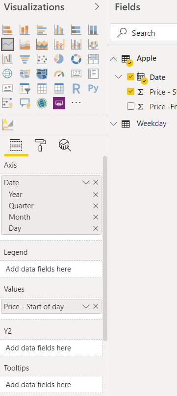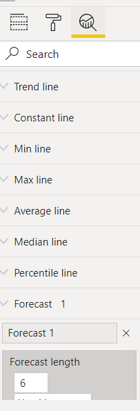 要使用预测功能,我们使用“分析”选项卡,“分析”面板允许你向视觉效果添加动态参考线,以提供重要趋势或信息的焦点。它位于Power BI桌面的可视化区域。