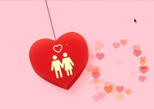 这是一款基于jQuery+CSS3实现的情人节悬挂摆动爱心特效,画面中心的心型图案呈现出时钟摆动的动画效果,周围的图案与背景也会有很小的心形动画浮动显示与隐藏的视觉效果,十分的唯美