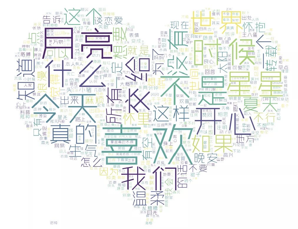 用Python将你们的聊天记录/TA的朋友圈文字制作成漂亮的词云图,当然背景图片的选择可以是爱心、玫瑰等等,而关于词云图的制作,网上有着很多的资料,当然小编之前也写过教程,最后出来的效果图大致是,