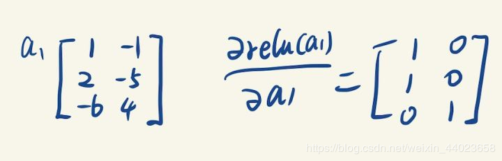 在计算 a1梯度的时候,我们遇到了relu激活函数,relu函数的梯度也很好求:它的梯度就是在输入X的基础上,所有大于0的位置导数都是1,其他位置导数都是0,比如: