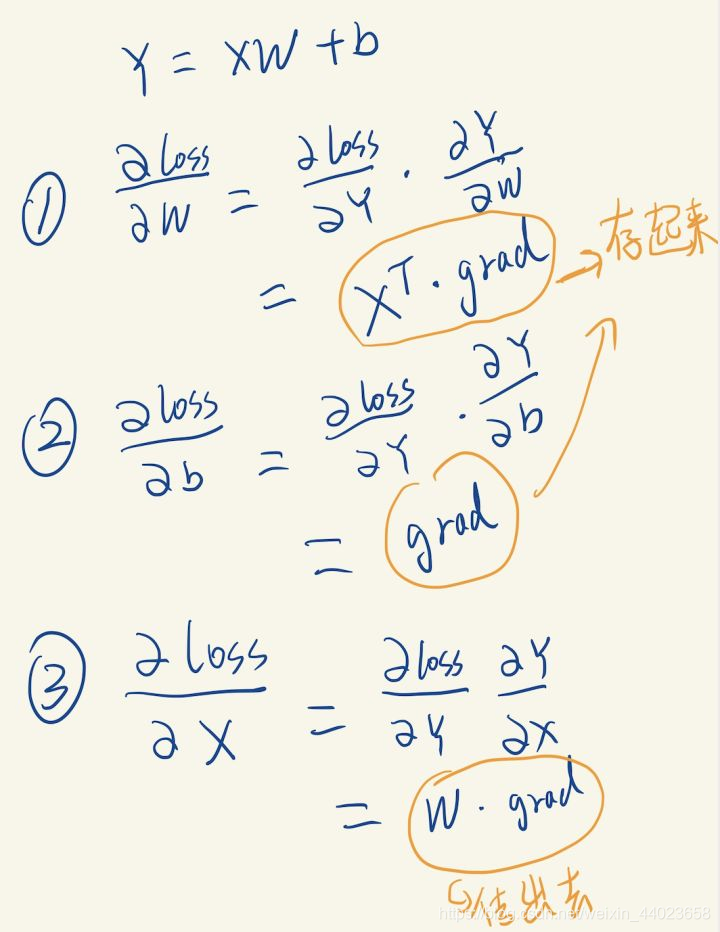 backward里面其实要计算3个值,W, b的梯度算完以后要存起来,前一层的梯度算完以后直接作为返回值传出去,推导的公式如下:注意矩阵求导应用链式法则的时候,顺序非常重要。要严格按照指定顺序来乘,不然形状对不上。具体什么顺序,可以自己想办法慢慢拼凑出来。