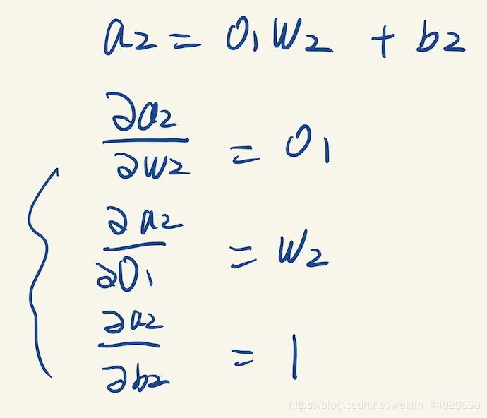 继续往左计算梯度:上图中 a2 关于它每个变量的梯度,可以直接根据 a2 与它左边3个变量的表达式来算出,如下: