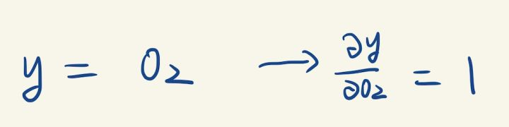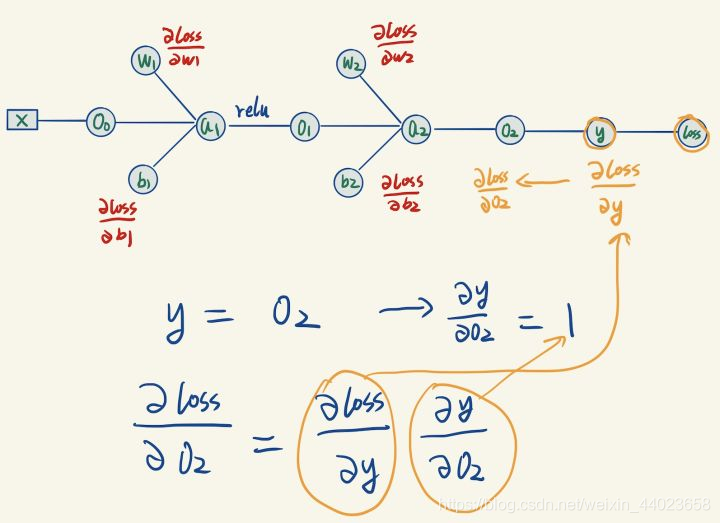 (已经求出的梯度我们用橙色来标记)y是通过O2计算出来的,我们可以计算y关于O2的梯度: