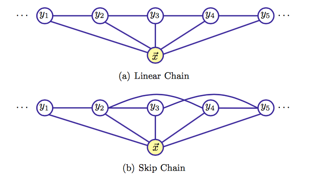 其中表示在图中与结点有边连接的所有结点,表示结点以外的所有结点。从CRF的定义我们大致能够明白它就是一个满足马尔可夫随机场的条件概率分布,我们以线性链CRF为例来看其参数化表达方法。