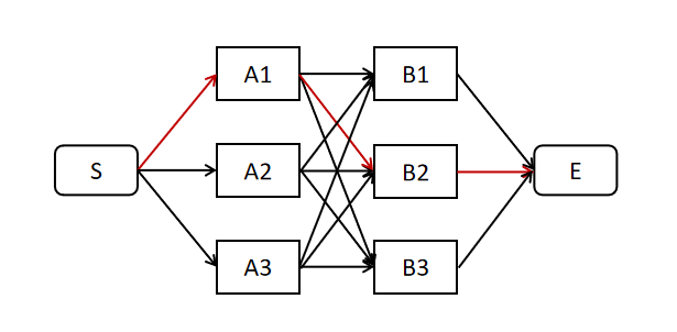 假设我们要在下述有向图中找出一条从到的最短路径。最简单粗暴的方法莫过于遍历所有路径然后比较一条最短的,但这么做时间复杂度太高。而维特比算法就是一种可以高效寻找最优路径的算法。