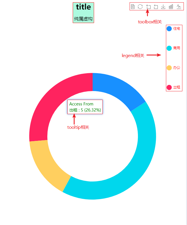 {b} : {c} ({d}%)", //a代表图例的名称 b代表选择属性的名称 c代表选择属性的值 d代表所占百分比// 插入一个图例// formatter: function(param) {// // 传参选择图例的各个属性param// setTimeout(function() {// // 接收参数和挂载echarts图例的dom节点// that.childRegByChart(param, 'regChart')// }, 100)// // 定义一个挂载图例的div// var res = ""// return res// },// childRegByChart(param, ele) {// this.childrenData = []// for (const i in name) {// this.childrenData.push({// value: name[i].data,// name: name[i].seriesName// })// }// var myChart = this.$echarts.init(document.getElementById(ele))// myChart.setOption({// // 里面正常设置图例的属性和数据// })// }},toolbox: { // 可视化的工具箱show: true,feature: {dataView: { // 数据视图show: true},restore: { // 重置show: true},dataZoom: { // 数据缩放视图show: true},saveAsImage: {// 保存图片show: true},magicType: {// 动态类型切换type: ['bar', 'line']}}},title: {// 是否显示show: true,// 主标题文本,'\n'指定换行text: 'title',// 副标题文本,'\n'指定换行subtext: '纯属虚构',// 水平安放位置,默认为左侧,可选为:'center' | 'left' | 'right' | {number}(x坐标,单位px)x: 'center',// 垂直安放位置,默认为全图顶端,可选为:'top' | 'bottom' | 'center' | {number}(y坐标,单位px)y: 'top',// 水平对齐方式,默认根据x设置自动调整,可选为: left' | 'right' | 'centertextAlign: 'center',backgroundColor: '#ADFADF', // 标题背景色borderWidth: 1, // 标题边框线宽,默认为0无边框borderColor: 'red', // 标题边框颜色padding: 5, // 标题内边距,默认各方向内边距为5,接受数组分别设定上右下左边距itemGap: 20, // 主副标题纵向间隔,单位px,默认为10textStyle: { // 主标题样式fontSize: 26,fontWeight: 'bolder',color: 'black'},subtextStyle: { // 副标题样式fontSize: 16,fontWeight: '400',color: '#cccff'}},legend: {type: "plain", // 提示的类型 'plain':普通图例 'scroll':可滚动翻页的图例zlevel: 1, // 所有提示的 zlevel 值itemGap: 50, // 提示的样式每项间隔x: '90%', // 提示的样式到图的距离icon: 'circle', // 提示的样式 圆点 circle, 正方形 rect, 圆角方形 roundRect, 三角triangle, 菱形diamond, 倒水滴pin, 箭头型arrow, 没有nonetop: '10%', // 提示到上部距离width: "auto", // 提示的宽度,可以设置值,百分比数值都行height: "auto", // 提示的高度orient: "horizontal", // 提示的布局朝向 'horizontal' 'vertical'align: "auto", // 提示标记和文本的对齐padding: 5, // 提示内边距itemWidth: 18, // 提示图标宽度itemHeight: 18,selectedMode: true, // 提示是否可以点击选择的模式inactiveColor: "#ccc", // 提示关闭时的颜色textStyle: { // 提示文字的样式color: 'red',fontSize: 12,rich: {a: {color: "red",lineHeight: 10,},b: {color: "#fff",lineHeight: 10,},//rich要结合formatter使用}}},series: [{name: 'Access From',type: 'pie',radius: ['50%', '70%'], // 中间白色圆周面积center: ['50%', '60%'], // 整个图左右距离hoverAnimation: true, // 鼠标放在图片上放大minAngle: 3, // 防止某个值过小导致扇区太小影响交互avoidLabelOverlap: false,label: {show: false, // 折点显示数值position: 'center'},itemStyle: { // 环形图中间加白条borderWidth: 3,borderColor: '#fff'},emphasis: {label: {show: true,fontSize: '16'// fontWeight: 'bold'}},labelLine: {show: false},data: [{ value: 3, name: '住宅' },{ value: 8, name: '商用' },{ value: 3, name: '办公' },{ value: 5, name: '出租' }]}]})// echarts 自适应window.addEventListener('resize', () => {myChart.resize()})},