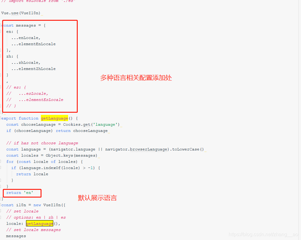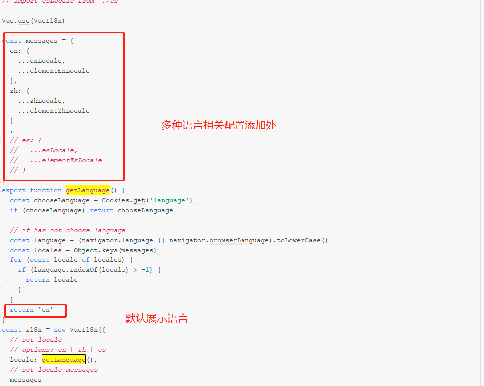 import Vue from 'vue' import VueI18n from 'vue-i18n' import Cookies from 'js-cookie' import elementEnLocale from 'element-ui/lib/locale/lang/en' // element-ui lang import elementZhLocale from 'element-ui/lib/locale/lang/zh-CN'// element-ui lang // import elementEsLocale from 'element-ui/lib/locale/lang/es'// element-ui lang import enLocale from './en' import zhLocale from './zh' // import esLocale from './es'Vue.use(VueI18n)const messages = {en: {...enLocale,...elementEnLocale},zh: {...zhLocale,...elementZhLocale},// es: {// ...esLocale,// ...elementEsLocale// } } export function getLanguage() {const chooseLanguage = Cookies.get('language')if (chooseLanguage) return chooseLanguage// if has not choose languageconst language = (navigator.language || navigator.browserLanguage).toLowerCase()const locales = Object.keys(messages)for (const locale of locales) {if (language.indexOf(locale) > -1) {return locale}}return 'en' } const i18n = new VueI18n({// set locale// options: en | zh | eslocale: getLanguage(),// set locale messagesmessages })export default i18n