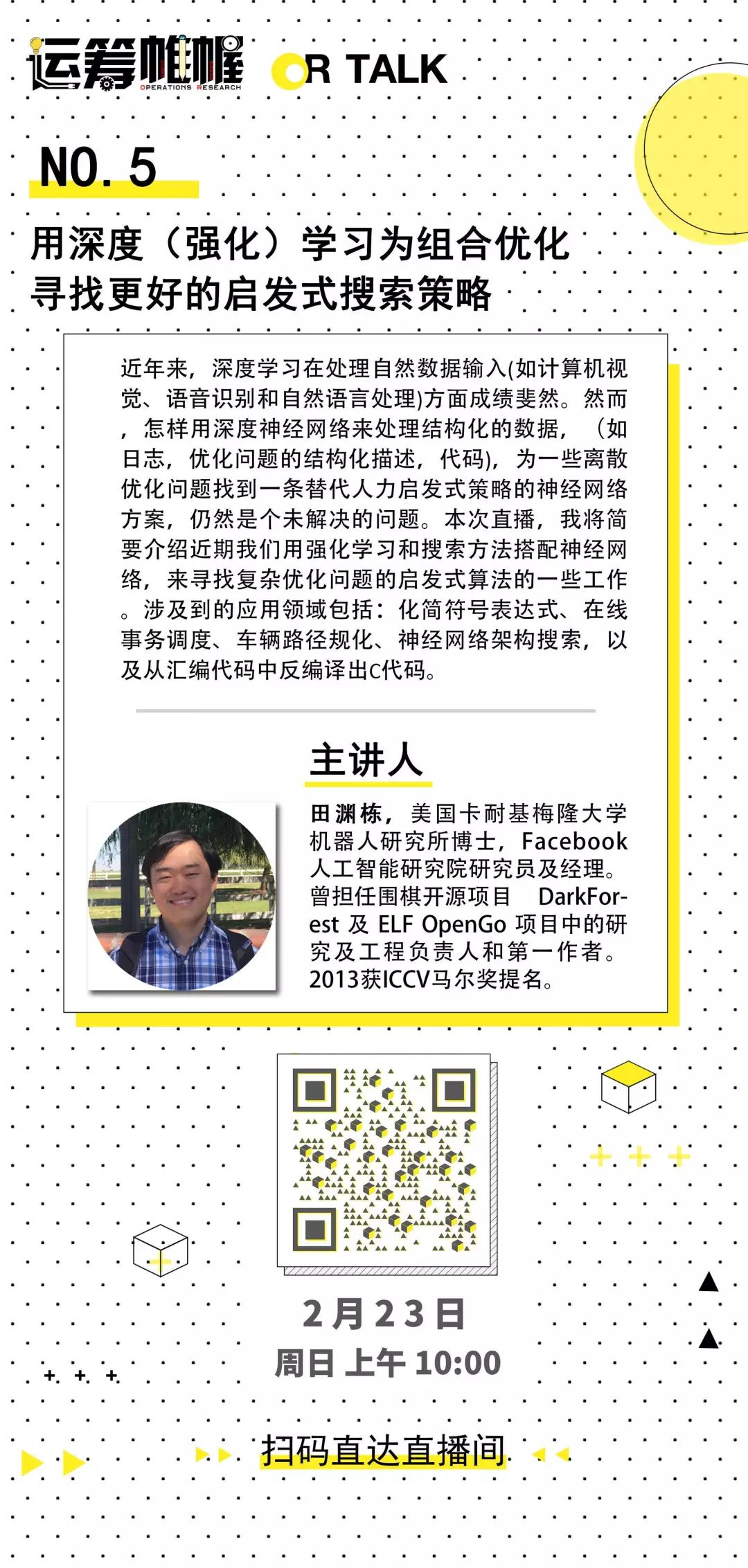 直播 NO.5 | Facebook 田渊栋:用深度(强化)学习为组合优化寻找更好的启发式搜索策略...