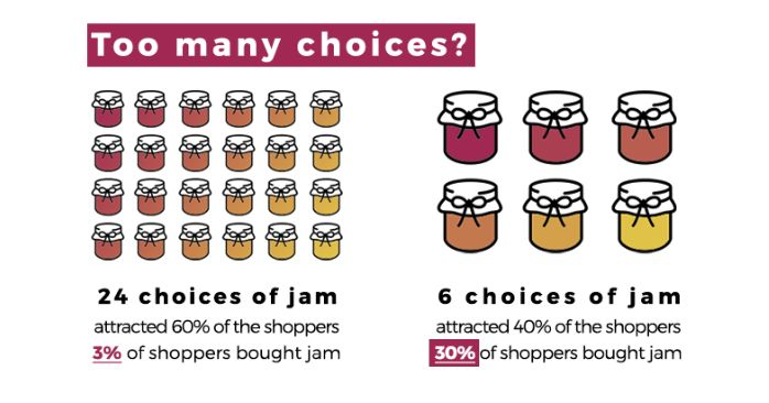 你听说过著名的果酱实验吗?2000 年,哥伦比亚大学和斯坦福大学的心理学家 Sheena Iyengar 和 Mark Lepper 在他们的实地实验基础上提出了一项研究。在平常的一天,消费者在当地食品市场的高档杂货店购物时,会看到一个展示 24 种果酱的品尝摊位。前几天,同一个摊位只展示了 6 种果酱。这个实验是为了判断哪个摊位的销量会更高,并假设更多种类的果酱会吸引更多的顾客,从而获得更多的生意。然而,一个奇怪的现象被观察到。尽管有 24 种果酱的柜台更能吸引顾客的兴趣,但与只有 6 种果酱的柜台相比,它们的转化率相当低(大约低 10 倍)。