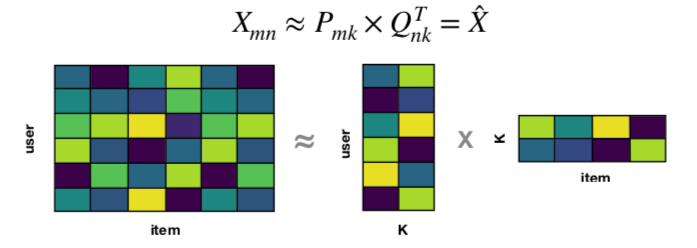 潜因子这里用K表示。此重建矩阵填充原始的用户-物品矩阵中的空单元格,因此未知评级现在已知。