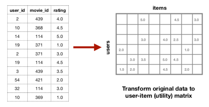 我们需要首先将电影评分数据转换成一个用户-物品矩阵,也称为效用矩阵。