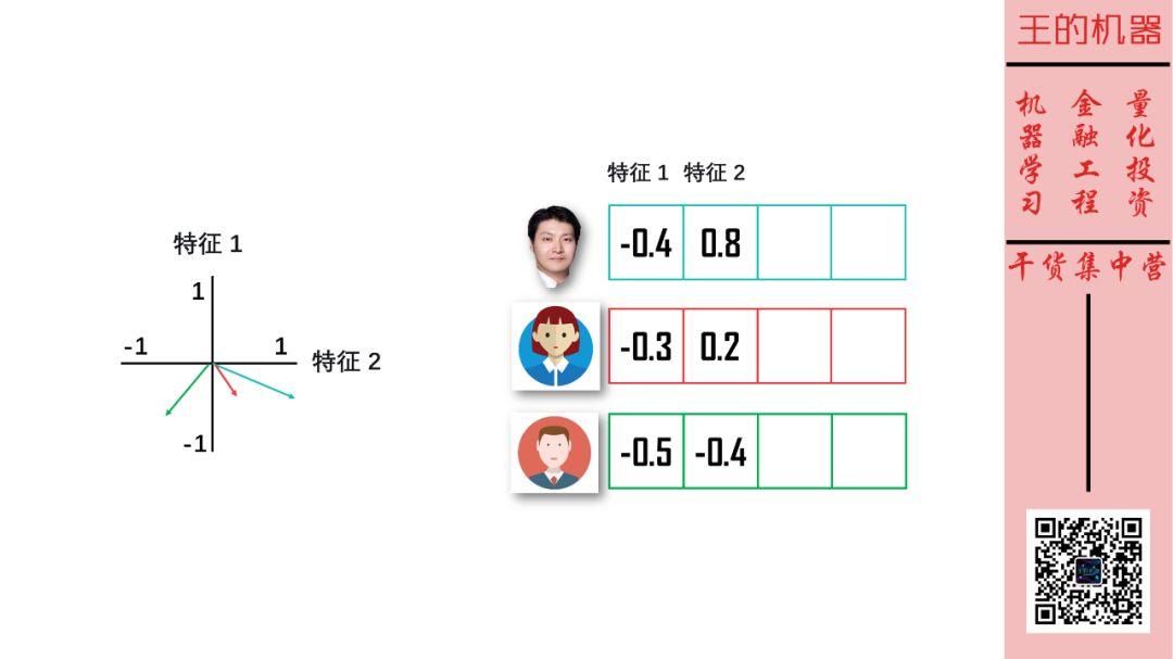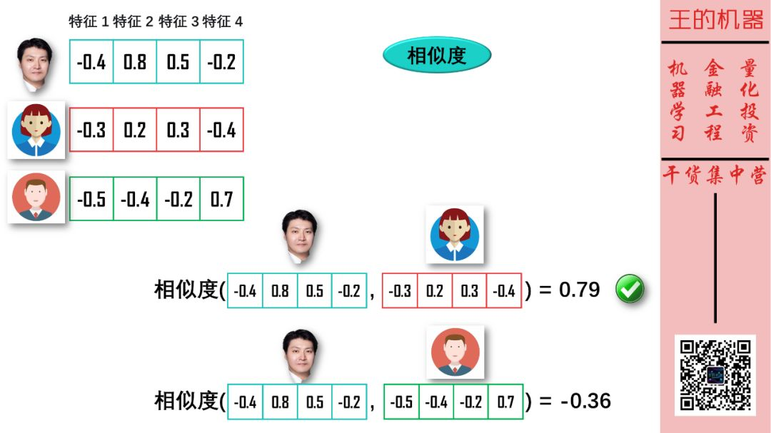 如果两个向量在很多维度上的颜色相同,那么这两个向量相似。