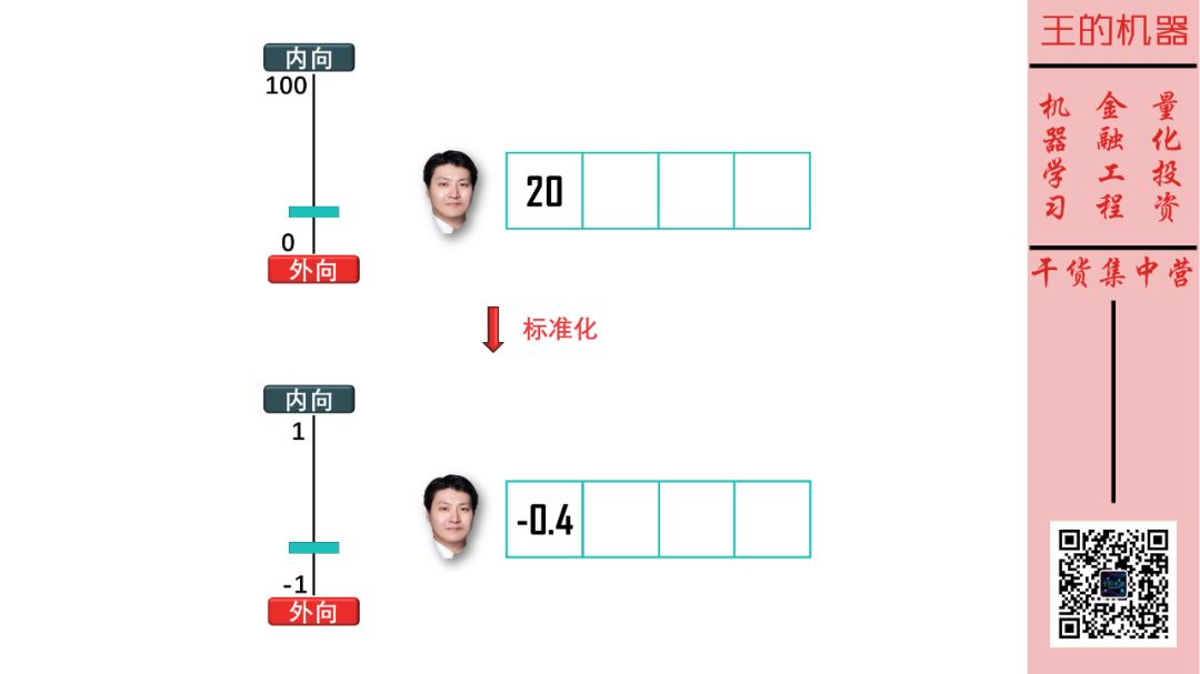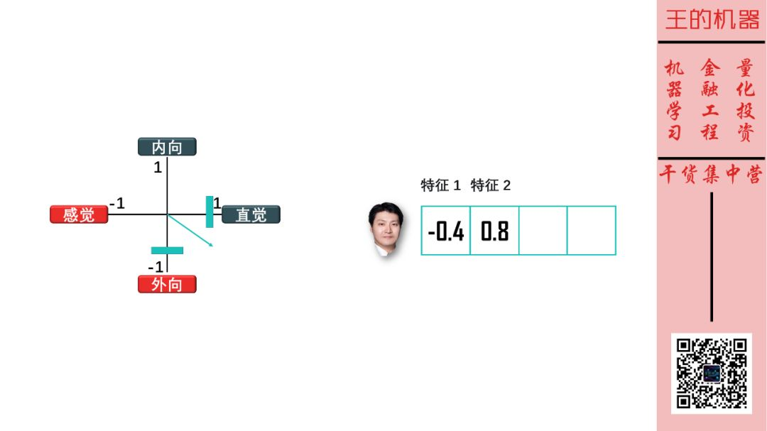 这样斯蒂文在「外向-内向」维度由一个实数 -0.4 来表示,该维度可看成是描述斯蒂文性格的一个特征。