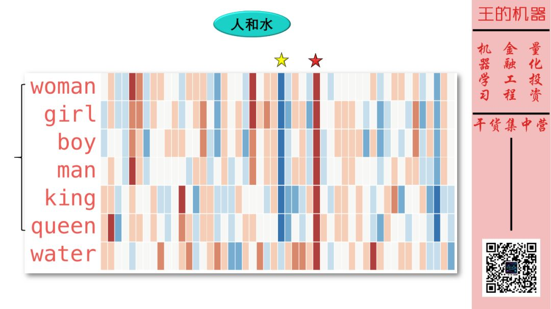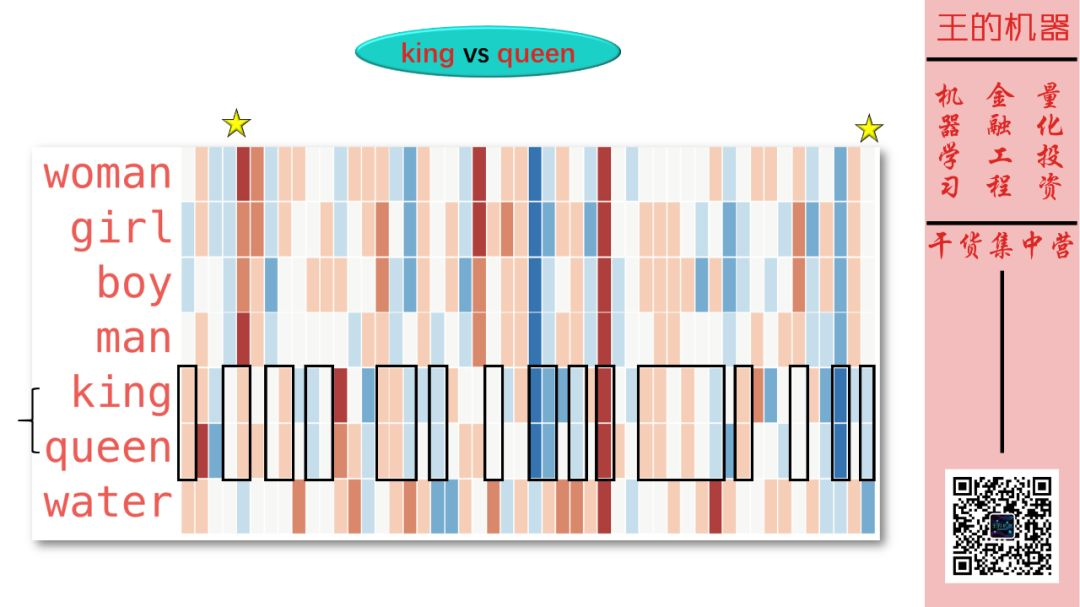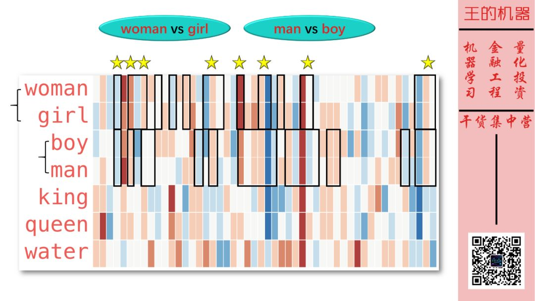 国王和皇后非常相似,但是它们的相似处 (用黄色五角星标注了) 在 (女人,男人)、(女孩,男孩) 这些「词对」中没有体现。该特征应该是有皇家色彩 。