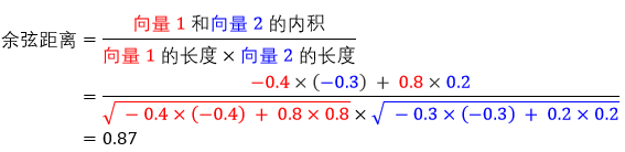 这里向量相似度是用余弦距离来计算,其值范围在 -1 到 1 之间,值越大 (1) 越相似,值越小 (-1) 越相反。对数学感兴趣的小孩 可以参考计算余弦距离的公式。