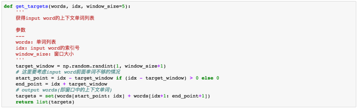 我们定义了一个get_targets函数,接收一个单词索引号,基于这个索引号去查找单词表中对应的上下文(默认window_size=5)。请注意这里有一个小trick,我在实际选择input word上下文时,使用的窗口大小是一个介于[1, window_size]区间的随机数。这里的目的是让模型更多地去关注离input word更近词。