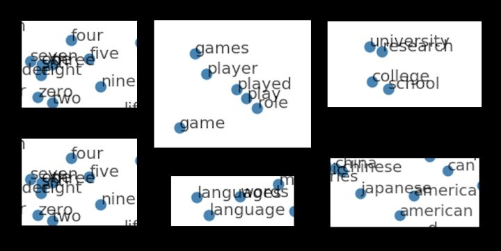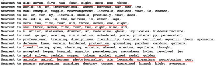 从最后的训练结果来看,模型还是学到了一些常见词的语义,比如one等计数词以及gold之类的金属词,animals中的相似词也相对准确。