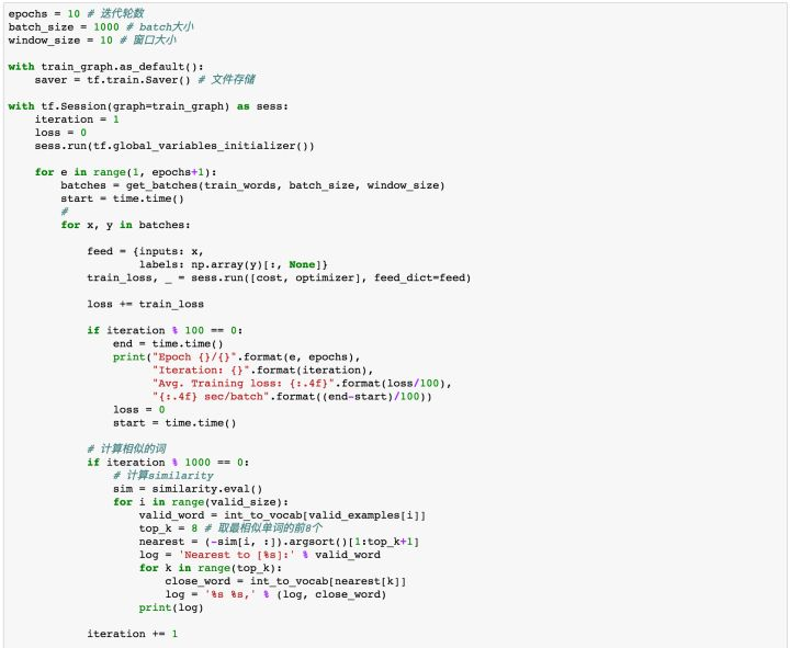 注意上面的代码对batch的处理。我们知道对于每个input word来说,有多个output word(上下文)。例如我们的输入是“fox”,上下文是[quick, brown, jumps, over],那么fox这一个batch中就有四个训练样本[fox, quick], [fox, brown], [fox, jumps], [fox, over]。