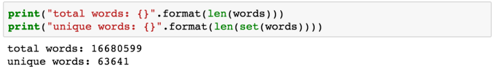 整个文本中单词大约为1660万的规模,词典大小为6万左右,这个规模对于训练好的词向量其实是不够的,但可以训练出一个稍微还可以的模型。