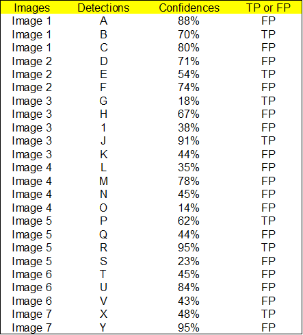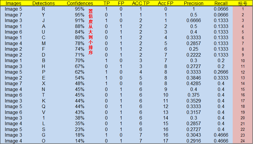 根据上图以及说明,我们可以列出以下表格,其中 Images 代表图片的编号,Detections 代表预测边框的编号,Confidences 代表预测边框的置信度,TP or FP 代表预测的边框是标记为 TP 还是 FP(认为预测边框与 GT 的 IOU 值大于等于 0.3 就标记为 TP;若一个 GT 有多个预测边框,则认为 IOU 最大且大于等于 0.3 的预测框标记为 TP,其他的标记为 FP,即一个 GT 只能有一个预测框标记为 TP),这里的 0.3 是随机取的一个值。