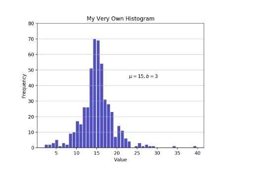 plt.text(23, 45, r'$\mu=15, b=3$')