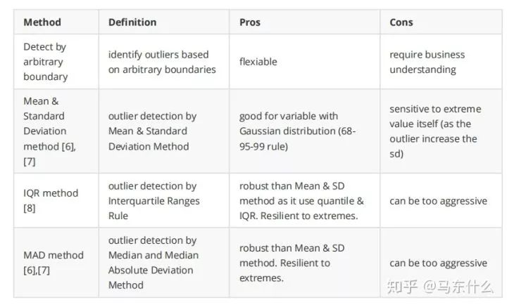 这里列出的所有方法都是用于单变量异常点检测的。多元孤立点检测超出了本指南的范围。(一般特征工程阶段也比较少考虑多维的异常点检测。。。因为太麻烦而复杂了)
