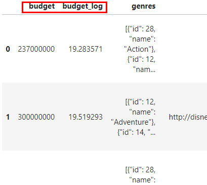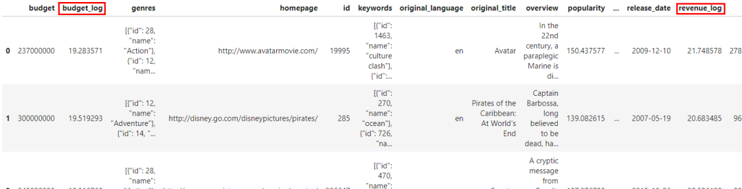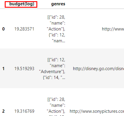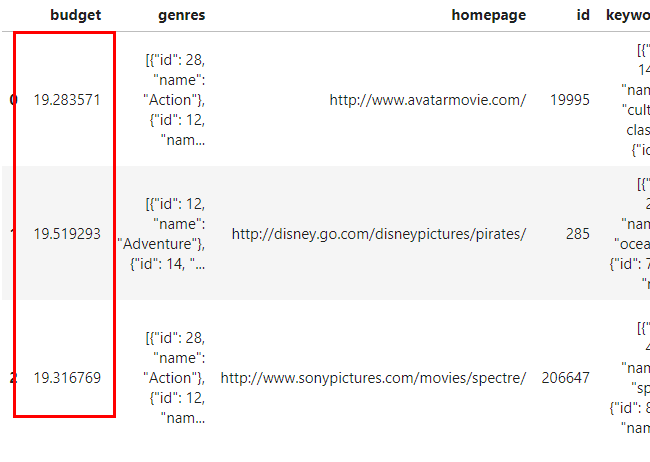 对应的结果如图14,可以看到在只传入columns和func这两个参数,其他参数均为默认值时,对budget列做对数化处理后的新列直接覆盖了原有的budget列:
