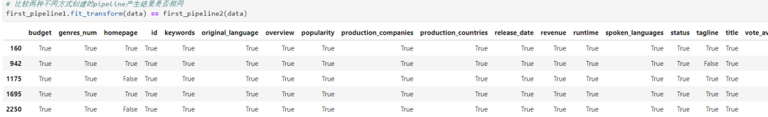 first_pipeline2 = pdp.PdPipeline([pdp.ColDrop("original_title"),pdp.ApplyByCols(columns=['title'], func=lambda x: x.lower()),pdp.RowDrop({'vote_average': lambda x: x <= 7, 'original_language': lambda x: x != 'en'}),pdp.ApplyByCols(columns=['genres'], func=lambda x: [item['name'] for item in eval(x)].__len__(), result_columns=['genres_num']),pdp.RowDrop({'genres_num': lambda x: x <= 5})])# 比较两种不同方式创建的pipeline产生结果是否相同