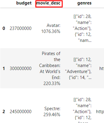 pdp.ApplyToRows(func=lambda row: f"{row['original_title']}: {round(((row['revenue'] / row['budget'] -1)*100), 2)}%"if row['budget'] != 0elsef"{row['original_title']}: 因成本为0故不进行计算",colname='movie_desc',follow_column='budget',func_desc='输出对应电影的盈利百分比').apply(data).head(3)