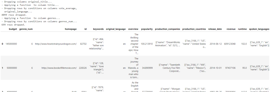 first_pipeline = pdp.PdPipeline([pdp.ColDrop("original_title"),pdp.ApplyByCols(columns=['title'], func=lambda x: x.lower()),pdp.RowDrop({'vote_average': lambda x: x <= 7, 'original_language': lambda x: x != 'en'}),pdp.ApplyByCols(columns=['genres'], func=lambda x: [item['name'] for item in eval(x)].__len__(), result_columns=['genres_num']),pdp.RowDrop({'genres_num': lambda x: x <= 5})])# 将创建的pipeline直接作用于data直接得到所需结果,并打印流程信息