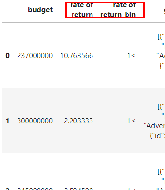 pipeline = pdp.PdPipeline([pdp.RowDrop(conditions={'budget': lambda x: x == 0,'revenue': lambda x: x == 0},reduce='any'),pdp.ApplyToRows(func=lambda row: row['revenue'] / row['budget'] - 1,colname='rate of return',follow_column='budget'),pdp.Bin(bin_map={'rate of return': [0, 1]}, drop=False)])