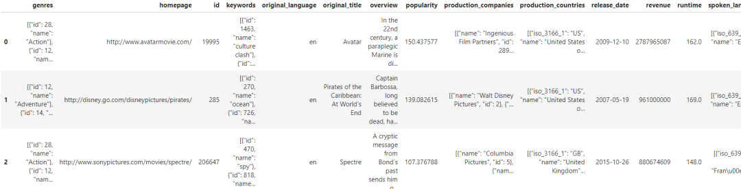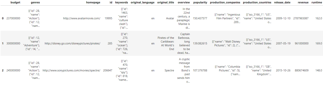 import pdpipe# 读入tmdb_5000_movies.csv数据集并查看前3行