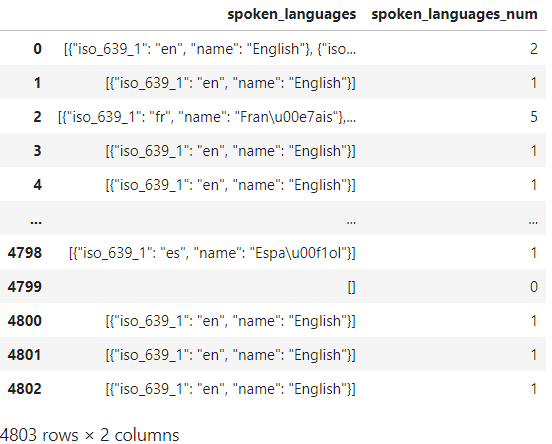 pdp.ApplyByCols(columns='spoken_languages',func=lambda x: [item['name'] for item in eval(x)].__len__(),drop=False,result_columns='spoken_languages_num').apply(data)[['spoken_languages', 'spoken_languages_num']]