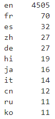 # 过滤original_language频次低于10的行,再次查看过滤后的数据original_language频次分布