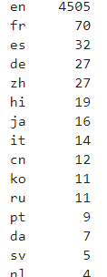 下面是举例演示,首先我们来查看电影数据集中original_language列对应的频次分布情况: