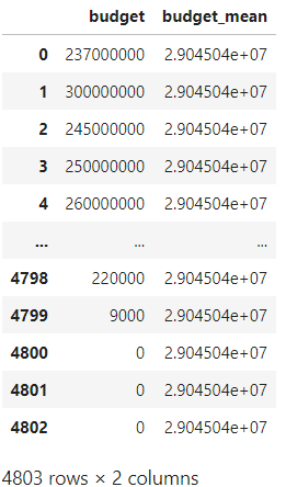 pdp.AggByCols(columns='budget',func=np.mean, # 这里传入的函数是聚合类型的drop=False,suffix='_mean').apply(data).loc[:, ['budget', 'budget_mean']]