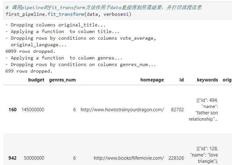 first_pipeline1 = pdp.make_pdpipeline(pdp.ColDrop("original_title"),pdp.ApplyByCols(columns=['title'], func=lambda x: x.lower()),pdp.RowDrop({'vote_average': lambda x: x <= 7, 'original_language': lambda x: x != 'en'}),pdp.ApplyByCols(columns=['genres'], func=lambda x: [item['name'] for item in eval(x)].__len__(), result_columns=['genres_num']),pdp.RowDrop({'genres_num': lambda x: x <= 5}))# 以pdp.PdPipeline传入流程列表的方式创建pipeline