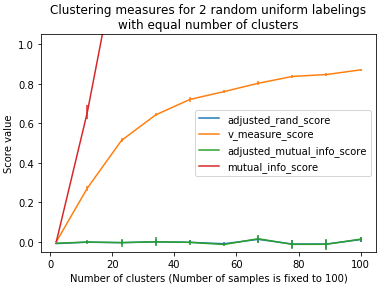 2)对于任意的簇类数和样本数,随机分配标签的ARI分数接近于0;